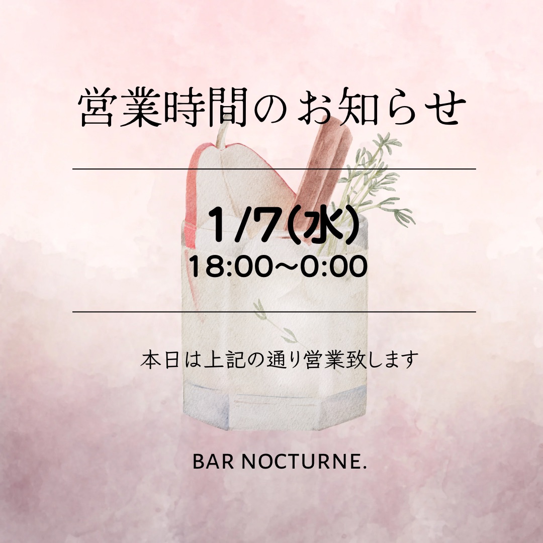8/8(木)【営業時間のお知らせ】引屋敷 18:30~0:30 2024 8/08 お知らせ 2024年8月8日 8/8(木)【営業時間のお知らせ】 本日は店主 引屋敷が18:30~0:30まで営業致します。 bar nocturne.店主 お知らせ よかったらシェアしてね! URLをコピーしました! URLをコピーしました! 8/6(火)【新作スパイスカレー】■牛ひき肉とズッキーニのキーマカレー ¥930- 8/6(金)【新入荷情報】[非売品ウイスキー]サントリー100周年記念ウイスキー「感謝」 ¥2,000-(15ml) 関連記事 1/7(水)【営業時間のお知らせ】18:00~0:00 1/6(火)【営業時間のお知らせ】引屋敷 18:00~0:00 1/5(月)【営業時間のお知らせ】引屋敷 18:00~0:00 1/4(日)【お正月営業最終日】15:00~23:00 1/3(土)【新作スパイスカレーとマサラおせち】15:00~23:00 1/2(金)【マサラおせち小皿提供します】営業時間15:00~23:00 1/1(木)【新年営業のご案内】 12/30(火)【営業時間のお知らせ】引屋敷 15:00~0:00