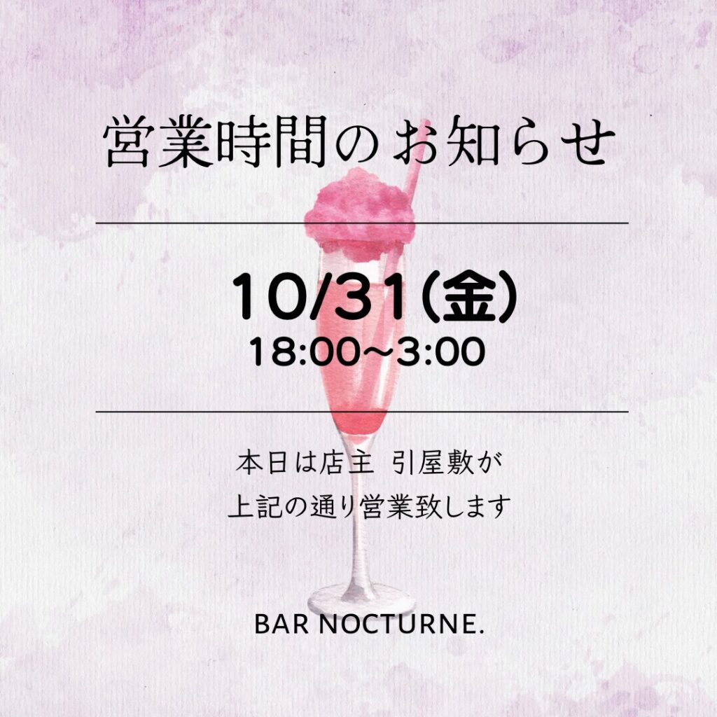 10\31(金)【営業時間のお知らせ】引屋敷18:00~3:00 2025 11/08 お知らせ 2025年10月31日2025年11月8日 10/31(金)【営業時間のお知らせ】 本日は引屋敷が18:00~3:00まで営業いたします。 bar nocturne.引屋敷 お知らせ よかったらシェアしてね! URLをコピーしました! URLをコピーしました! 10/29(水)【臨時休業のお知らせ】 11/2(日)【11月の営業予定】 関連記事 11/6(水)【営業時間のお知らせ】引屋敷 18:00~0:00 自動下書き 11/1(土)【営業時間のお知らせ】二人体制 18:00~3:00 11/8(土)■とある自治体の地域振興 カクテル販売 12:00~0:00 11/2(日)【11月の営業予定】 10/29(水)【臨時休業のお知らせ】 10/28(火)【新入荷情報】konohana × Teen spirits ¥1,350- 10/27(月)【社員研修のお知らせ】本日は店休日となります