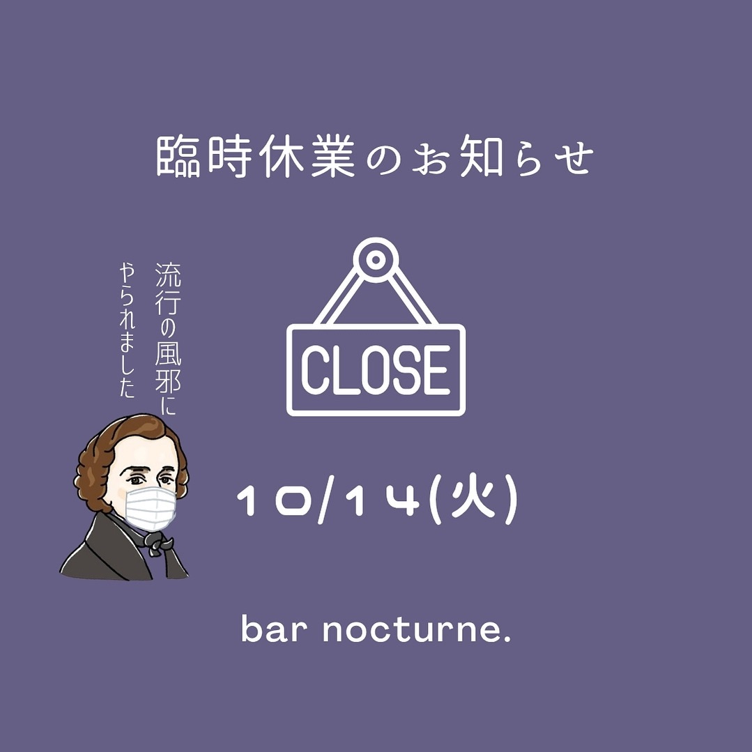 7/14(木)【店休のお知らせ】 誠に勝手ながら本日の営業は店主体調不良のため店休とさせていただきます。 復調できれば明日より営業再開致します。 ご心配ご迷惑をおかけして申し訳ありません。 bar nocturne.店主 -